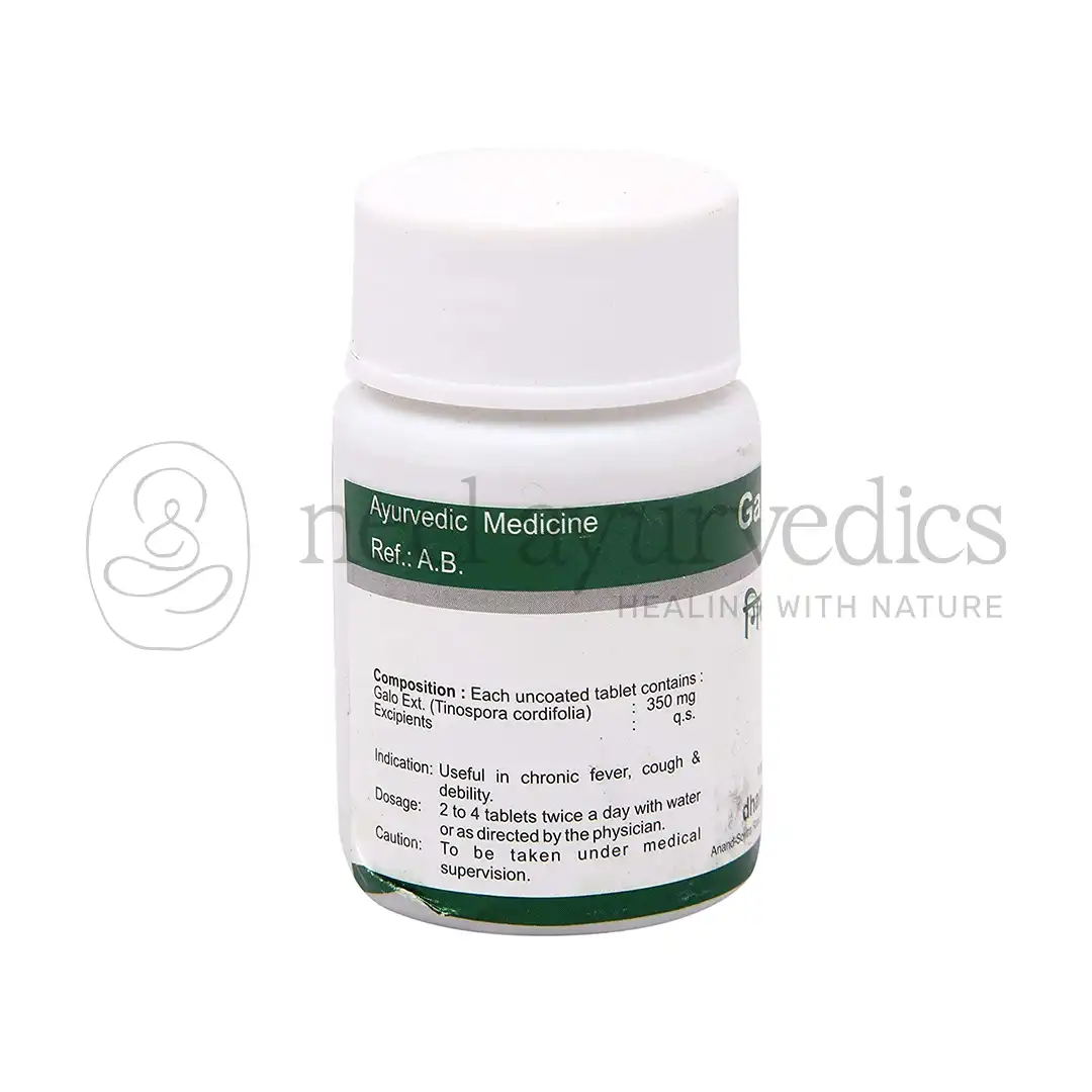 Dhanvantari Giloy/Galo Ghan Vati is Beneficial in general weakness, fever,skin and urinary disorders. Giloy Ghan Vati contains extract of Giloy (botanically known as Tinospora Cordifolia). It is a potent immuno-modulator herb. It is beneficial for improving immunity and preventing common infections.
