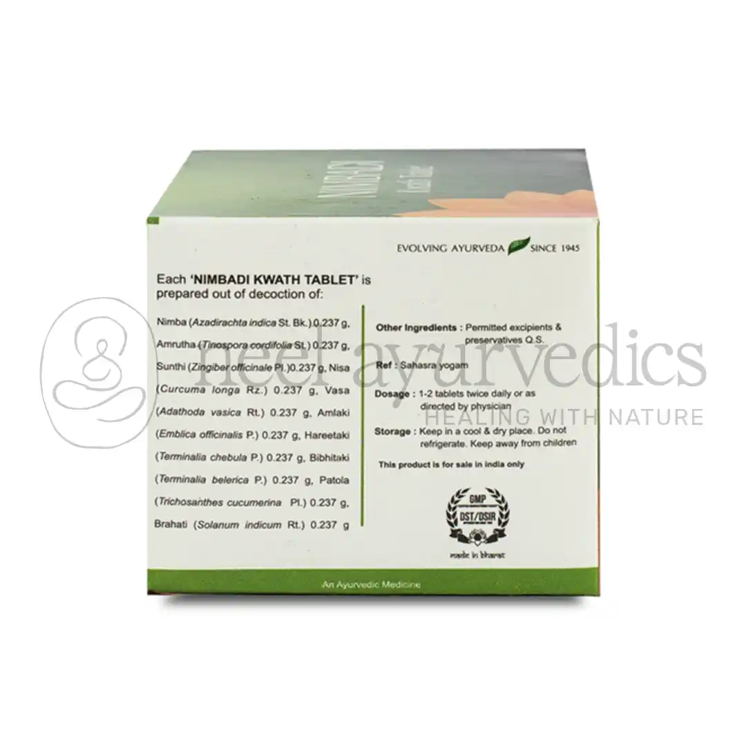 Nimbadi Kwath Tablet is an Ayurvedic medicine for balancing Kapha-Pitta that contains Neem and other herbal ingredients. It is said to be beneficial in the ayurvedic treatment of skin disorders.