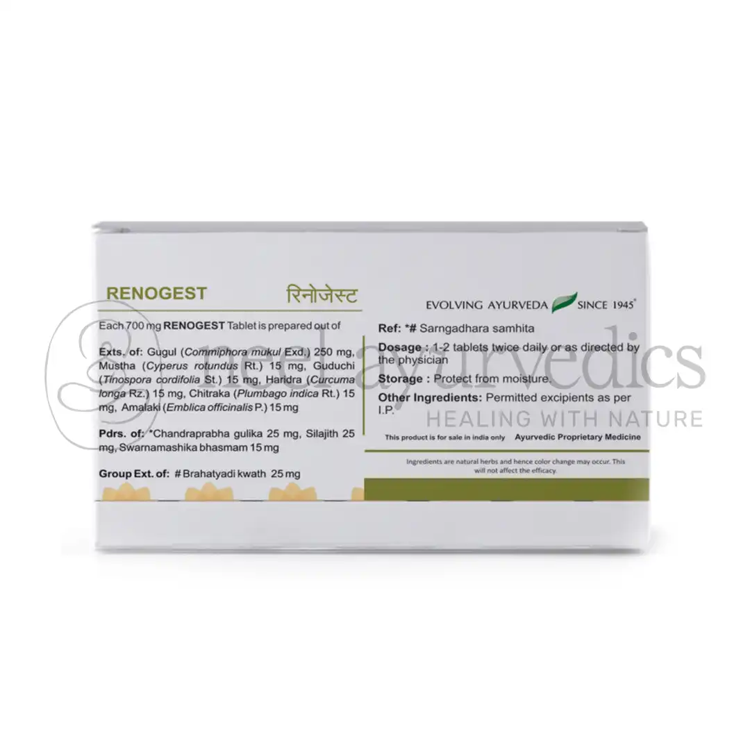 Renogest tablet is a one-of-a-kind proprietary formulation that can help with recurring urinary tract infections. Musta , Guduchi , Haridra , Citraka , Amalaki , Gugulu , and two traditionally proven Ayurvedic formulations, Brihatyadi kwath and Chandraprabha gulika, are included.