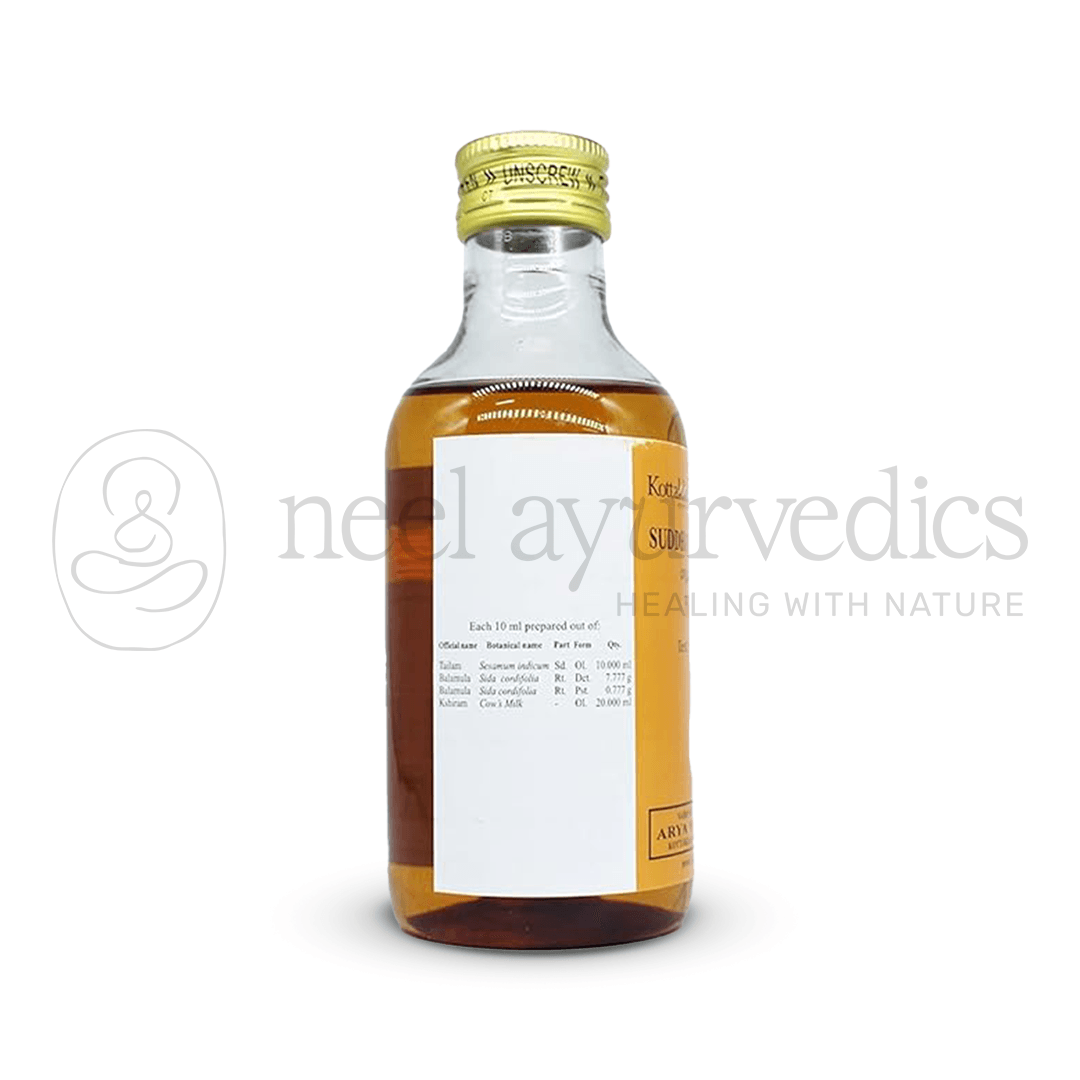Kottakkal Arya Vaidya Sala Sudhabala Tailam is a classical Ayurvedic medicated oil known for its rejuvenating and strengthening effects on the nervous and musculoskeletal systems. It is highly beneficial in managing rheumatic and neurological conditions caused by Vata imbalance. Prepared with Balamula and Ksheera (milk) in a base of sesame oil, this formulation nourishes the nerves, strengthens muscles, and supports joint flexibility.