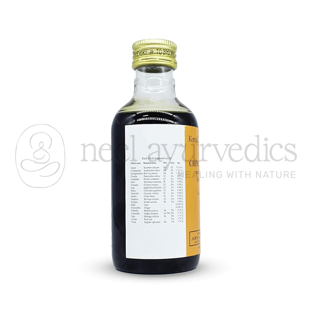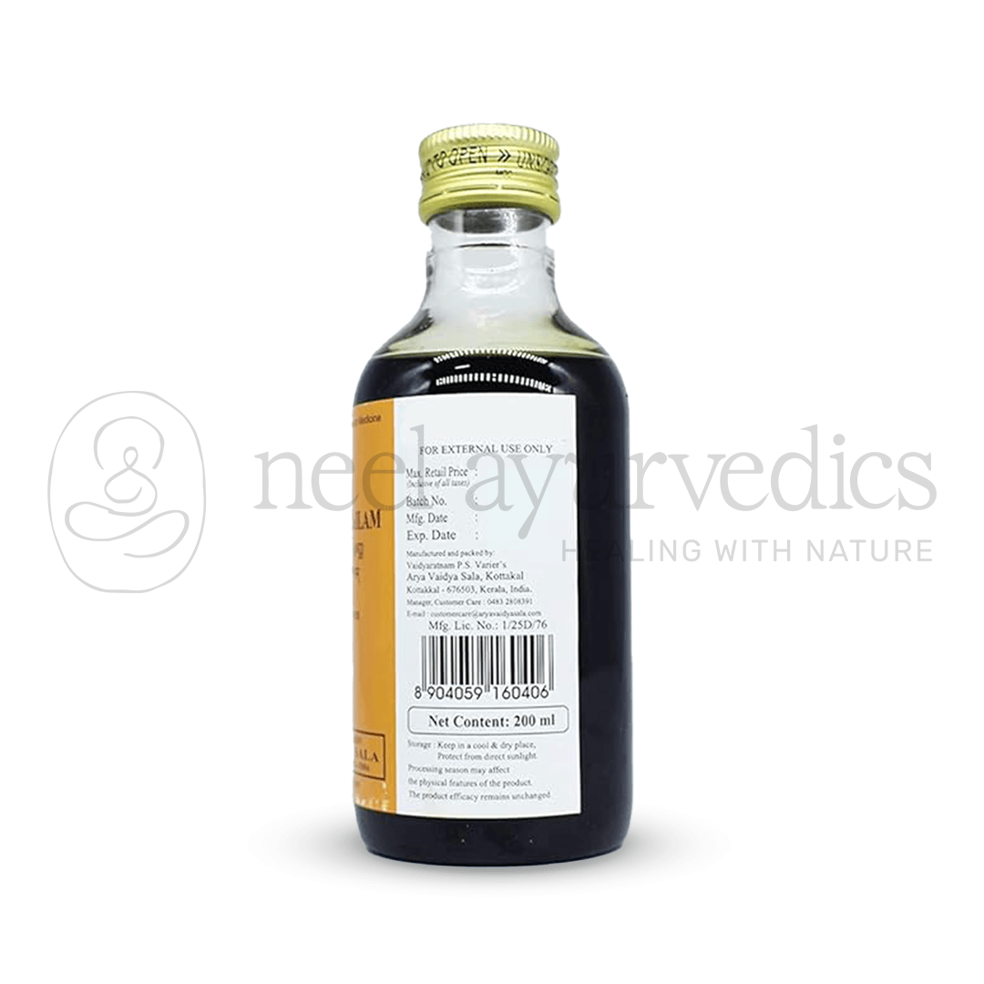 Kottakkal Arya Vaidya Sala Valiya Chinchadi Tailam is a traditional Ayurvedic oil formulation widely used in the management of acute and chronic rheumatic conditions. Prepared with a base of sesame, neem, and mustard oils, enriched with herbs like Tamarind, Castor, Moringa, Crateva, and Calotropis, it helps relieve joint pain, stiffness, swelling, and inflammation. The inclusion of ginger, rock salt, curd, and vinegar enhances its penetrating action, making it effective for musculoskeletal disorders.
