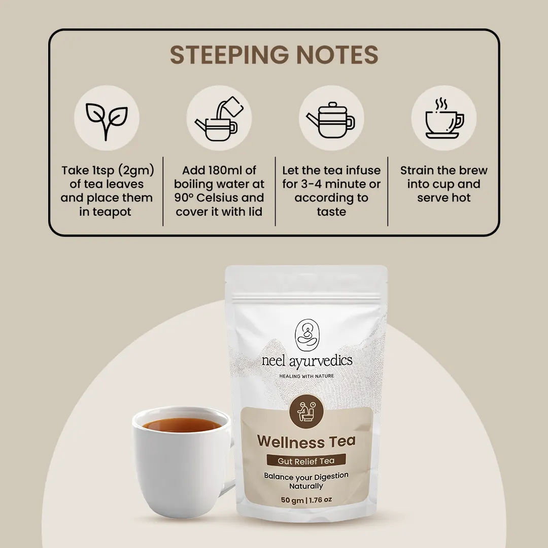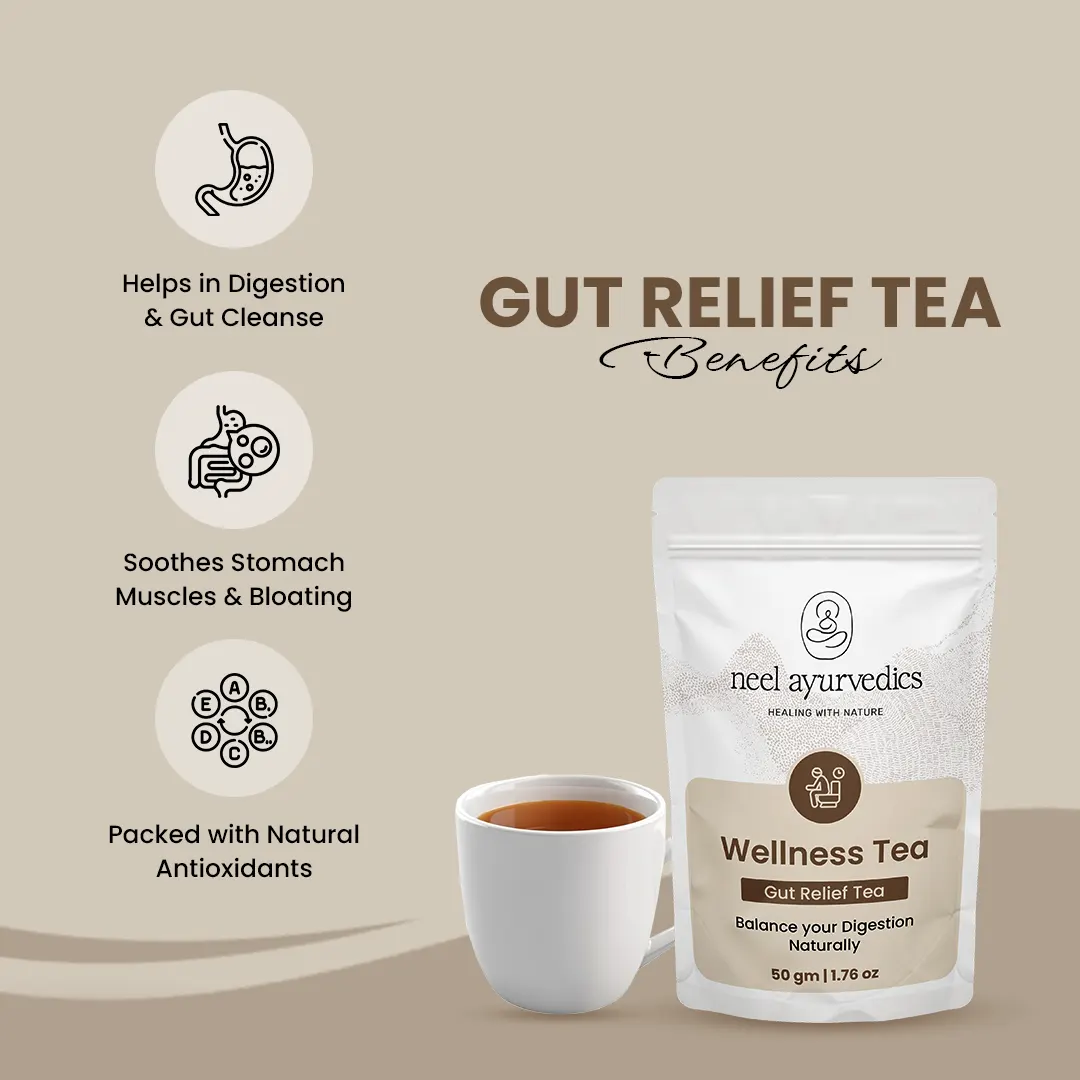 Neel Ayurvedics always strives to create tea products that are both delicious and health-boosting. We understand how essential gut health is to overall well-being. If your gut is not in optimal condition, you may experience a variety of uncomfortable symptoms such as sugar cravings, sleep disturbances, constipation, diarrhea, bloating, skin irritations, stress, weight gain, and more. With these concerns in mind, our Gut Relief Tea has been specially formulated by experts to support a healthier gut and improve digestive function.