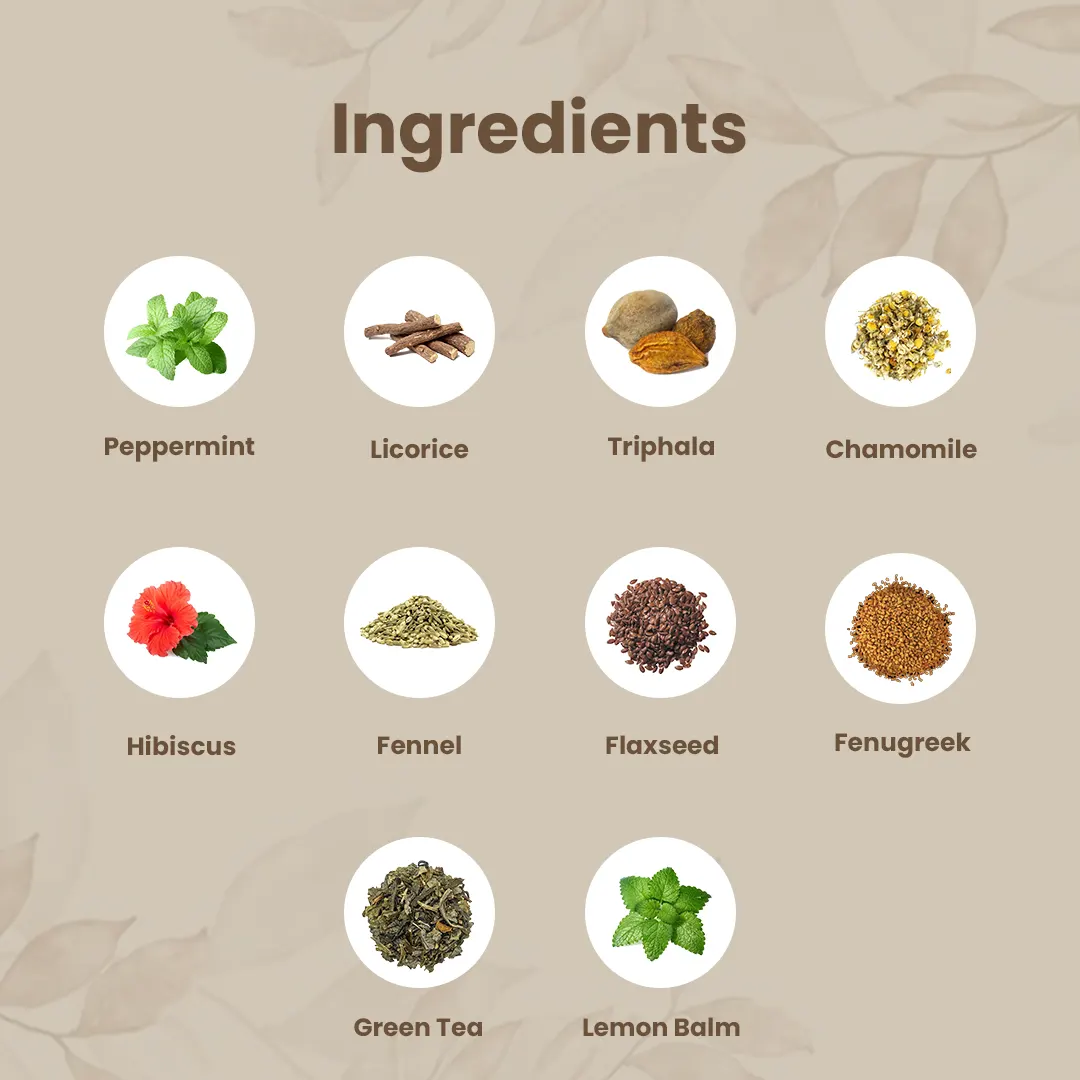This tea blends a carefully selected mix of herbs and ingredients, known for their beneficial effects on gut health, including Green Tea, Licorice, Triphala, Chamomile, Hibiscus, Fennel, Flaxseed, Fenugreek, and Lemon Balm. Each of these ingredients has been chosen for their proven ability to support digestion and alleviate common gut issues.