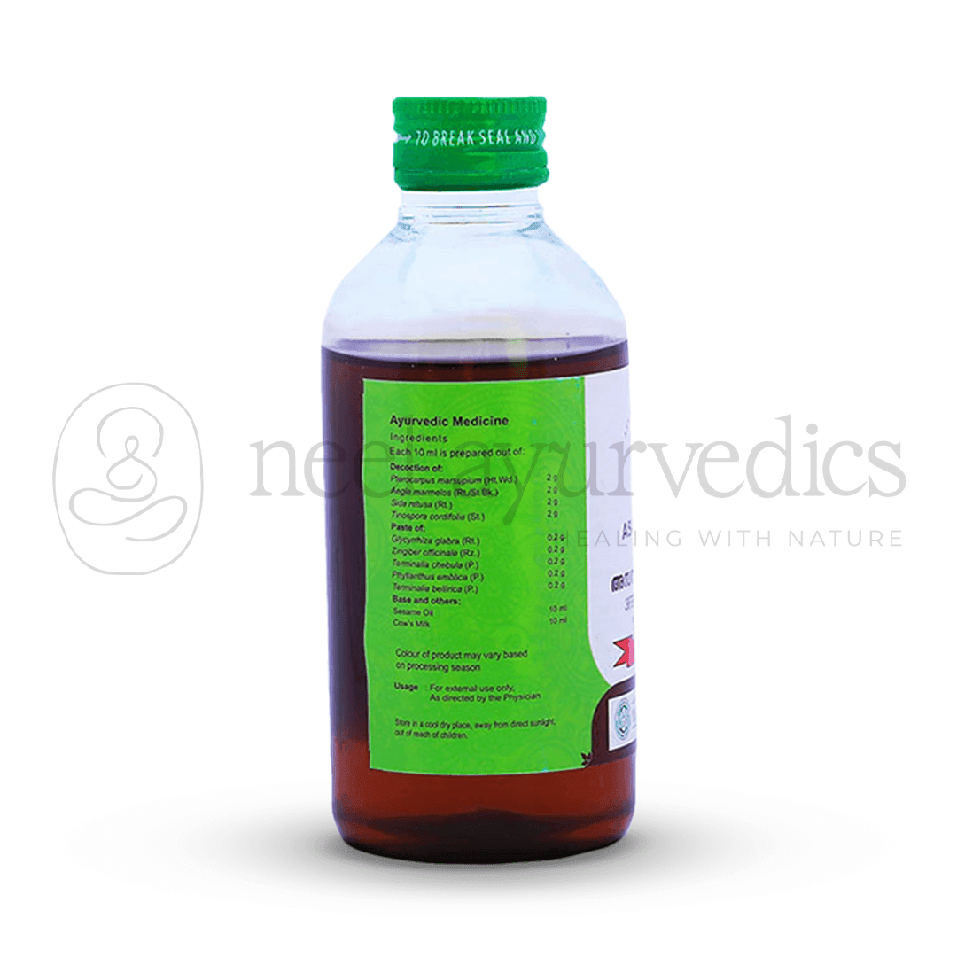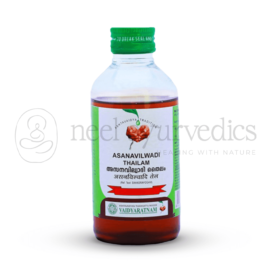 Vaidyaratnam Asanavilwadi Thailam is a classical Ayurvedic oil formulated for head, eye, and ear health. Enriched with natural herbs like Asana, Bilva, Bala, Guduchi, and Yashtimadhu, this oil helps relieve inflammation, discomfort, and irritation.