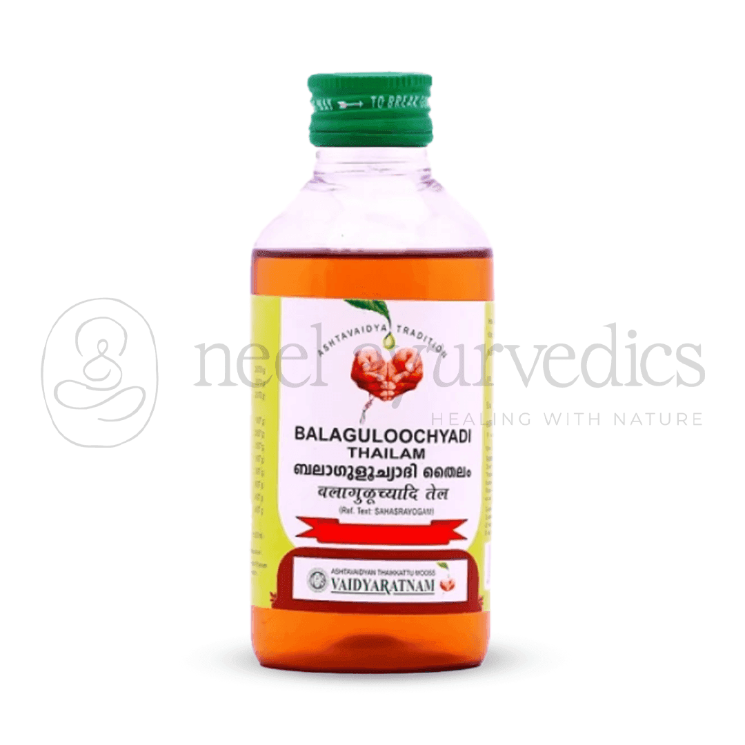 Vaidyaratnam Balaguloochyadi Thailam is a classical Ayurvedic medicated oil prepared following the principles of Kerala Ayurveda. Traditionally used in the management of gout and arthritis, this oil offers effective relief from joint pain, swelling, stiffness, and burning sensation. Enriched with herbs like Bala, Guduchi, Ashwagandha, Rasna, Devadaru, and Chandana, it helps restore mobility, reduces inflammation, and promotes overall musculoskeletal health. While primarily used for external application in gout and arthritic conditions, it is also considered beneficial for the head and respiratory system, offering relief in catarrh and related complaints.