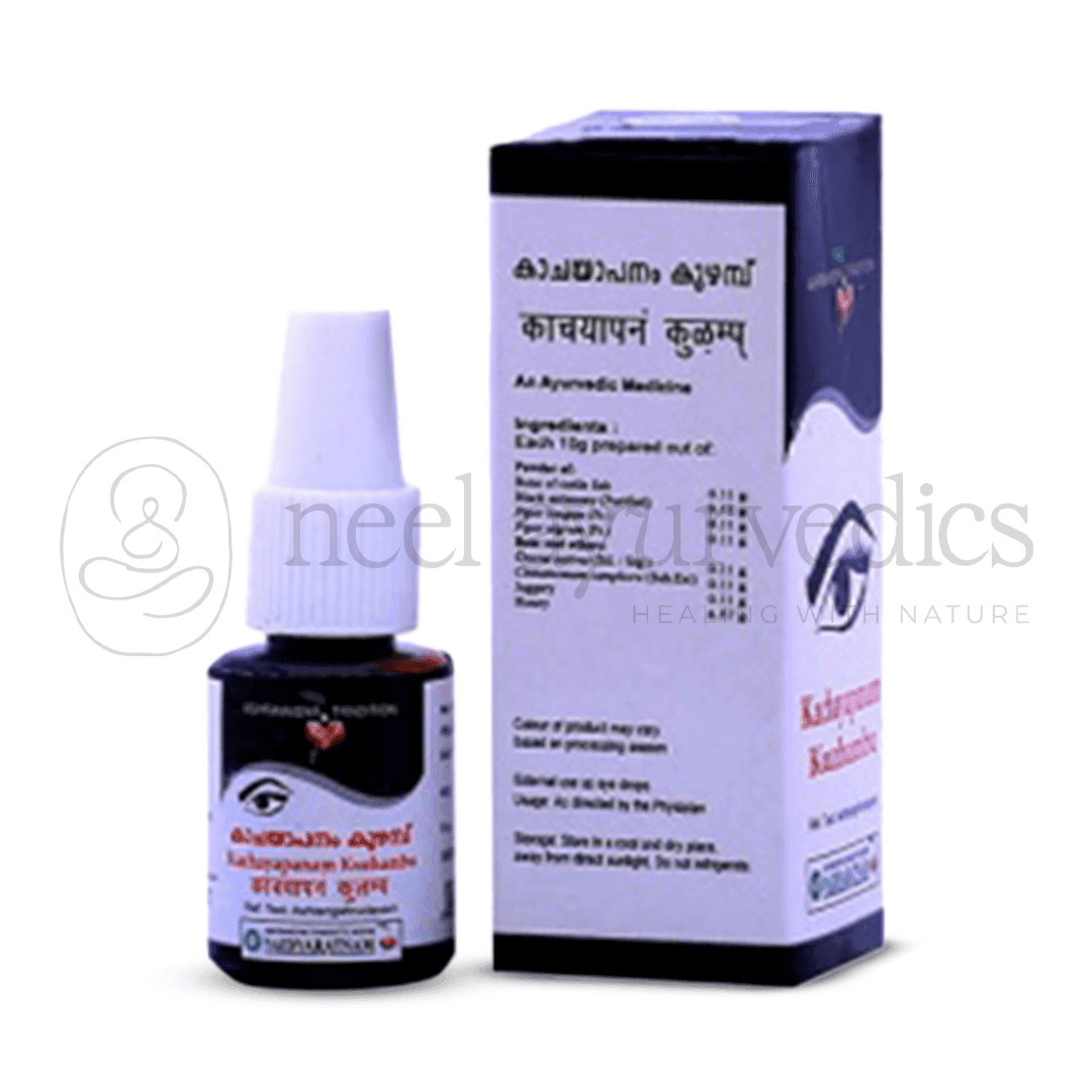 Vaidyaratnam Kachayapanam is a specialized Ayurvedic formulation designed to provide natural support in the management of cataracts. Prepared with potent traditional ingredients such as Samudraphena (Cuttlefish Bone), Anjana (Black Antimony – purified), Krishnajeeraka, Maricha, Kunkumam, Jaggery, and Honey, this preparation is intended to nourish and support eye health, promoting clearer vision and alleviating symptoms associated with cataract formation.