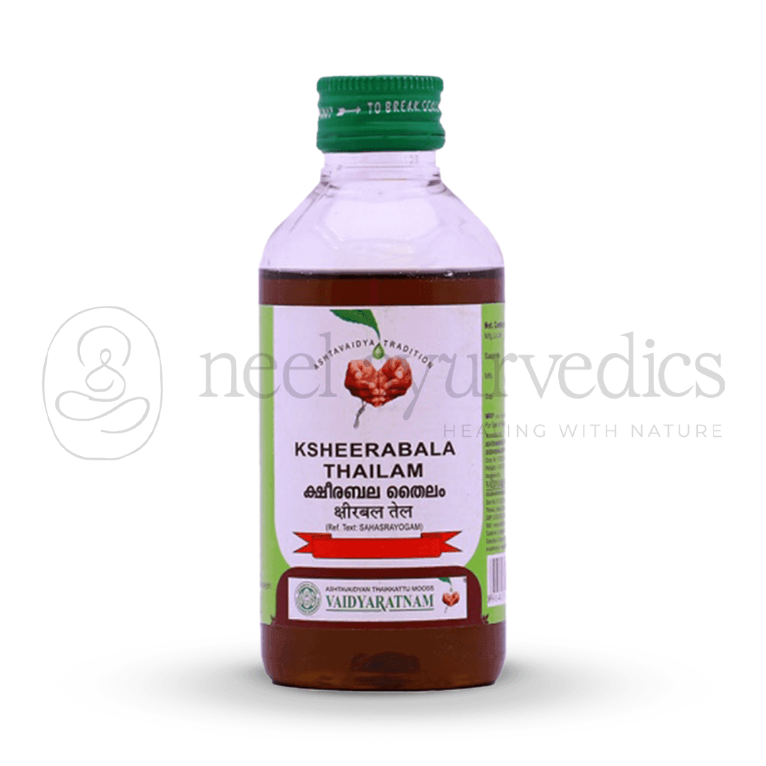 Vaidyaratnam Ksheerabala Thailam is a classical Ayurvedic oil, carefully prepared with Bala (Sida retusa), cow’s milk, and sesame oil. Known for its nourishing and calming properties, this thailam is highly beneficial in managing rheumatic disorders, neurological debility, hypertension, insomnia, and rheumatoid arthritis.