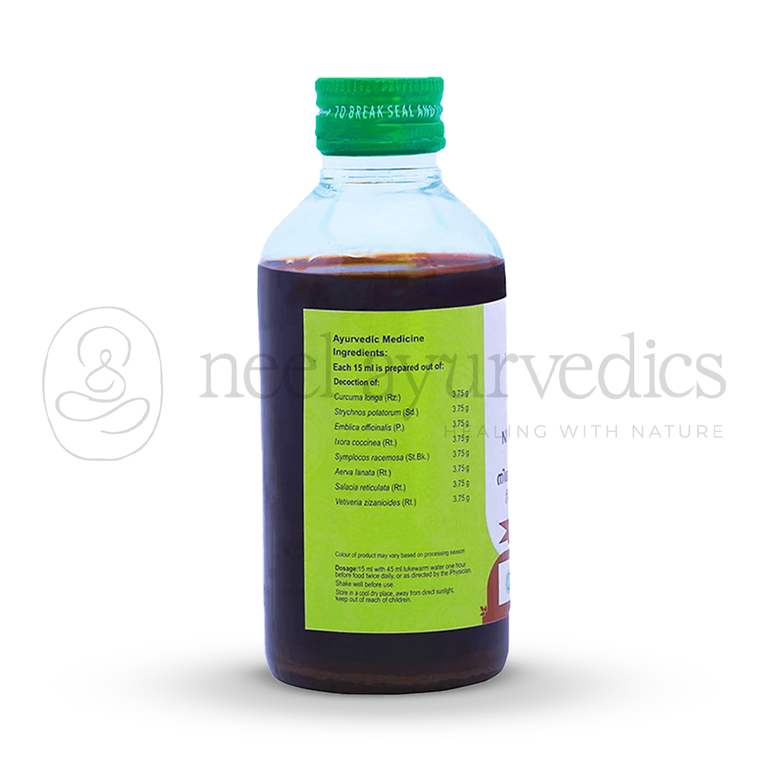 Vaidyaratnam Nishakathakadi Kashayam is a time-tested Ayurvedic formulation that supports diabetes management and overall metabolic health. This 200 ml herbal decoction is specially crafted to help lower blood glucose levels, improve insulin function, and prevent complications associated with long-term diabetes. Rooted in Kerala’s traditional Ayurvedic wisdom, it provides a natural, holistic approach to maintaining healthy sugar levels and preventing imbalances.