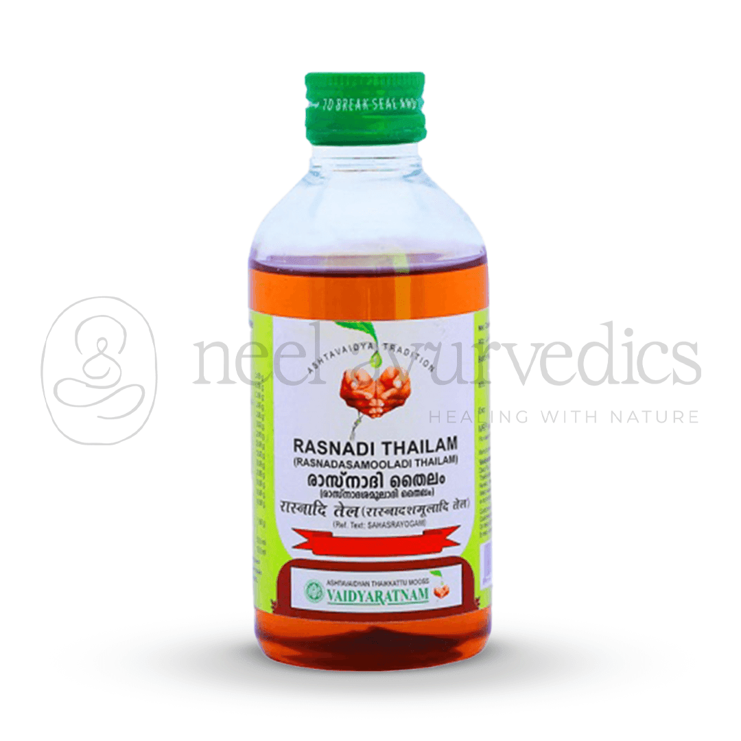 Vaidyaratnam Rasnadi Thailam is a powerful Ayurvedic formulation traditionally used for the management of facial paralysis, headaches, and sinus-related disorders. This herbal oil, enriched with potent nerve-strengthening herbs, helps improve circulation, reduce inflammation, and restore natural facial muscle tone. It is widely trusted in Ayurveda for its ability to support nervous system health and promote overall relaxation.