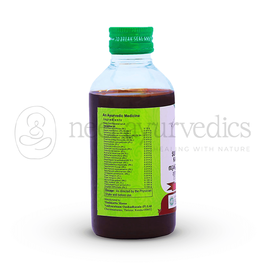 By balancing Vata and Pitta doshas, Sukumaram Kashayam promotes smooth menstrual flow, improves uterine health, and supports reproductive vitality. It also enhances digestion and reduces inflammation, making it a comprehensive tonic for women’s overall well-being.