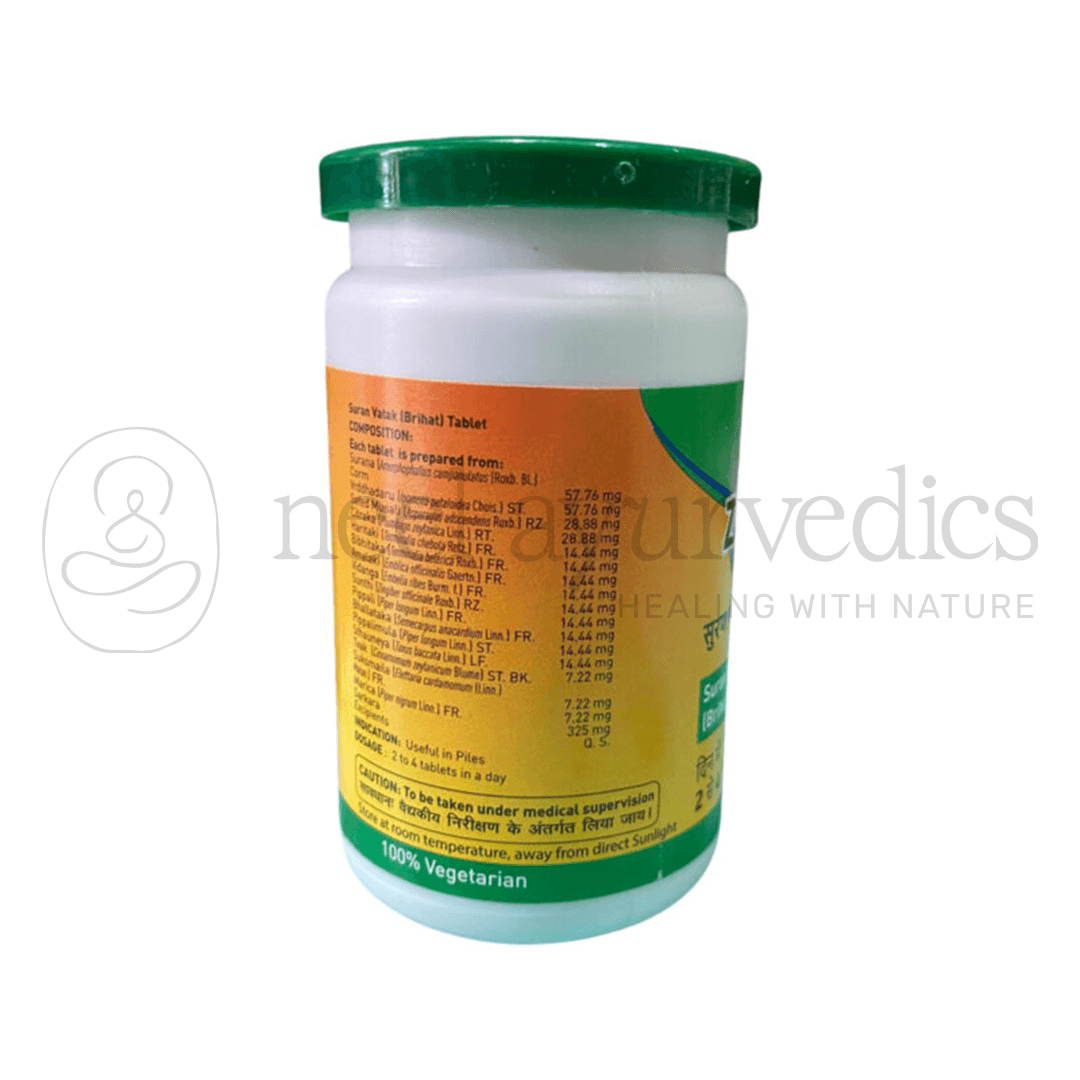 Zandu Suran Vatak (Brihat) Gutika is an Ayurvedic medicine used to treat piles, constipation, and other related conditions. It is made with natural ingredients that work together to provide relief from pain and discomfort caused by piles and regulate bowel movements to prevent constipation.